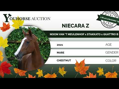 Die vierjährige Niecara Z hat in diesem Jahr einen Fohlen bekommen und ist in einem schönen Alter, um mit ihrer Ausbildung zu beginnen. Sie ist eine leichtfüßige Stute. Vater Nixon van ’t Meulenhof absolvierte 1,60 m Grand Prix-Springen mit Jos Verlooy und ist Halbbruder von fünf 1,60–1,70 m Grand Prix-Pferden, darunter das berühmte Emerald van ’t Ruytershof. Nixons älteste Nachkommen sind acht Jahre alt, wie Renshaw van ’t Meulenhof (1,55 m GP) sowie die 1,50 m springende Remco van den Uilenbos und Wheeler. Mutter Lisa du Mesnil stammt von der Top-Vererberin Stakkato ab. Großmutter Zienna du Mesnil (Quattro B) ist eine Elitemerrie, die 1,30 m Parcours sprang. Zienna brachte das 1,40 m Springpferd Enrico du Mesnil hervor und ist selbst Halbschwester von drei 1,60 m Grand Prix-Pferden: Pomme-Lady, Triton und Wienna du Mesnil.