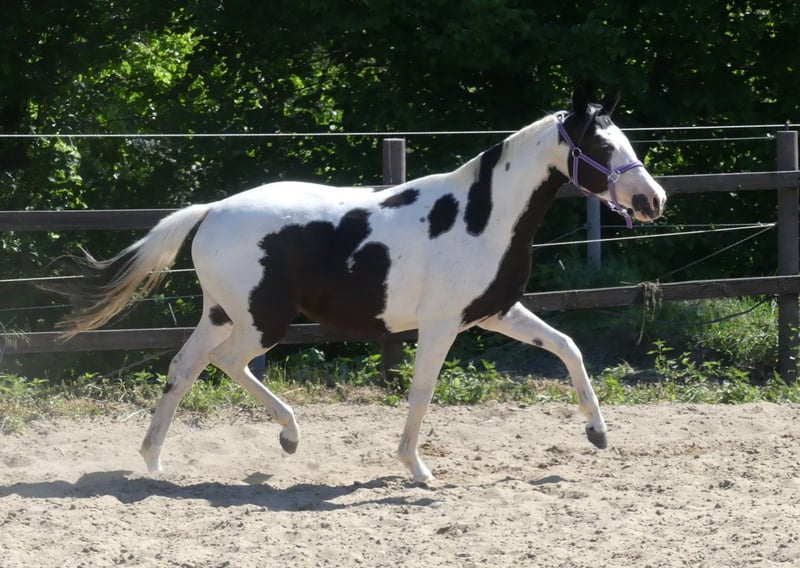 Une garantie de couleur à cent pour cent pour tous les amis des pie et les éleveurs. Nous vendons dans des mains appréciatives notre jument pie de race pure âgée de 4 ans, avec de bons mouvements et une excellente lignée. Avec ses 156 cm, elle est malheureusement un peu petite pour nos objectifs sportifs, c'est pourquoi elle a seulement été longée et saillie jusqu'à présent. Elle est gentille et facile à gérer, tant seule qu'en groupe. Actuellement, elle est gestante du premier lot du étalon pie de race pure Outlander Z / (Obi-Wan). Sweet Caroline Z a été saillie naturellement lors de son premier essai. De cette union naîtra un poulain de race pure avec de bons papiers recherchés pour la poursuite de l'élevage. Le prix augmentera en raison des coûts de soins et de nourriture à mesure que la gestation avance. Avec une formation supplémentaire, elle conviendrait également comme une excellente monture pour dames, juniors ou cavaliers en reconversion.