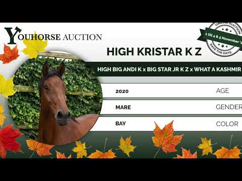Der fünfjährige High Kristar K Z wirkt modern im Erscheinungsbild. Er verfügt über viel Blut, ist leichtfüßig und schnell vom Boden abgehoben. High Kristar K Z stammt aus der Familie von Taloubet Z, dem Weltcup-Final-Sieger mit Christian Ahlmann. Züchter High Big Andi K (Big Star Jr.) ist ein AES-Stallion mit einer Größe von 1,55 m, der auf Grand Prix-Niveau mit Michael Greeve erfolgreich ist. Er stammt aus derselben Linie wie der bekannte Mr. Itt (1,60 m Grand Prix mit Eric Willems Geeroms), der bereits mit neun Jahren den Grand Prix von Malmö gewann. Die Mutter Brownie Kristar K Z ist eine Nachkommin des genannten Big Star Jr. KZ (1,55 m Grand Prix). Die Großmutter What a Zirkoon K Z brachte ein Springpferd auf 1,30 m Niveau. Die Urgroßmutter Zirkoon de Semilly (Diamant de Semilly x Polydor) stellte drei Pferde auf 1,30–1,50 m Niveau und ist Halbschwester des Weltcup-Siegers Taloubet Z, Obadja (1,60 m GP), Nadal Hero & DB (1,60 m GP), Big Star Jr. Z (1,55 m GP) sowie Jaloubet K VDL (1,50 m). Dieses Pferd stammt aus dem Stall eines der besten Züchter der Niederlande, der sogar als KWPN-Züchter des Jahres ausgezeichnet wurde. Taloubet und Big Star zählen zu seinen bekanntesten Zuchtprodukten. Die Pferde aus diesem Zuchtprogramm wurden in Ruhe und mit viel Platz aufgezogen, leben in Herden auf den Weiden und hatten stets die Zeit, sich natürlich zu entwickeln. Sie wurden nie trainiert – nur halftergeführt – und kommen direkt aus der Aufzucht. Dies macht sie besonders attraktiv für jeden, der ein junges Pferd nach eigenen Vorstellungen aufbauen möchte. Sie sind ehrlich, unverdorben und rein gezüchtet, direkt vom renommierten Züchter.