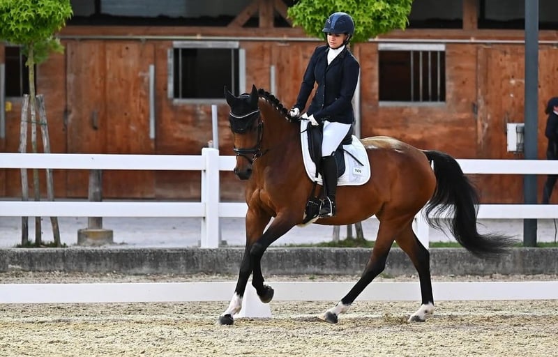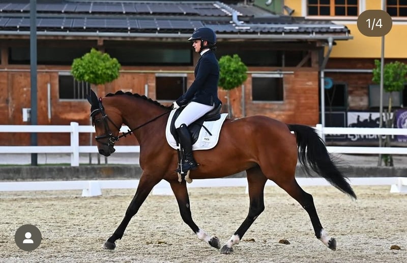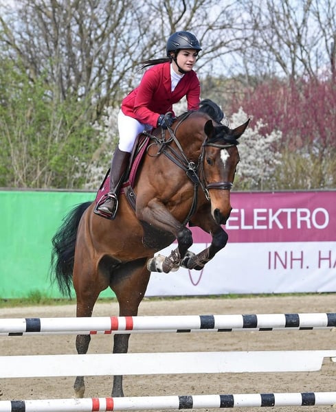 Carla Star è una splendida, sincera e talentuosa amazzone Zangersheide, con un’ottima genealogia e capacità versatili. Si distingue sia nel dressage, nel salto ostacoli e nel trekking – una vera cavalla polivalente con cuore e carisma. Ho personalmente iniziato a montarla con delicatezza e l’ho progressivamente addestrata. Durante tutto il percorso, ho sempre prestato attenzione al suo sviluppo fisico e mentale, portandola a diventare una partner pronta, motivata e soddisfatta. È estremamente buona, facile da gestire e molto piacevole nel rapporto. Anche i miei giovani allievi la cavalcano regolarmente – in indoor, all’aperto o durante uscite, da sola o in gruppo: Carla è sempre affidabile, calma e disposta a lavorare. Carla ha già vinto numerose gare di dressage di livello A e ha ottenuto punteggi fino a 8,0 nelle prove per puledri (105). Dimostra costantemente prestazioni eccellenti e ha gareggiato con successo nel campionato regionale: vincitrice regionale, campionessa statale e vicecampionessa statale, a testimonianza della sua qualità. Anche i salti in campagna sono affrontati con sicurezza, coraggio e grande gioia, rendendola particolarmente adatta a cavalieri poliedrici. In salto mostra un’azione potente e rotonda, con grande visione e capacità – anche nel salto libero non conosce limiti. Dal punto di vista sanitario, Carla è in perfetta forma. È disponibile un certificato veterinario completo con radiografie risalenti al momento dell’acquisto (a 2,5 anni). Da quando è in mio possesso, è sempre stata sana. A causa di una riduzione del patrimonio e dell’inizio del mio master, Carla viene affidata solo a persone di fiducia. È una vera cavalla da cuore, che porta gioia al suo cavaliere in ogni ambito – sportivo e quotidiano. Video su richiesta.