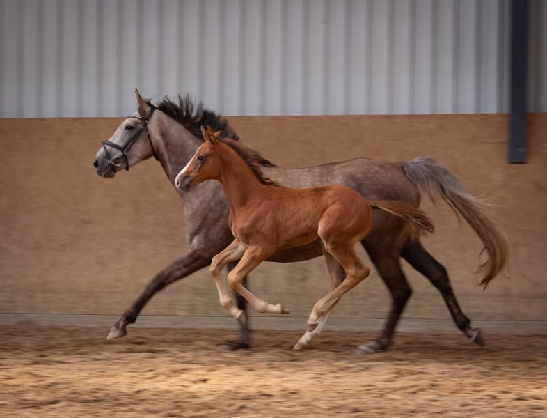 We are offering here an interestingly bred show jumping colt from our best bloodline. This young, energetic, and lively colt already knows where the piano is and shows great promise. The grandmother, Lene, by Levisto, is the dam of the 1.60m level successful mare "Call me Princess" and the grandmother of the 1.55m successful mare "Great Princess." The sire, "Toemme de Regor Z," with Chacco Blue, Cento, and Nabab de Reve, is linebred for Grand Prix potential and is considered a promising prospect at Zangersheide. The dam's sire, "Tangelo vd Zuuthoeve," and "Levisto" are also well-known worldwide as excellent jumping bloodlines.