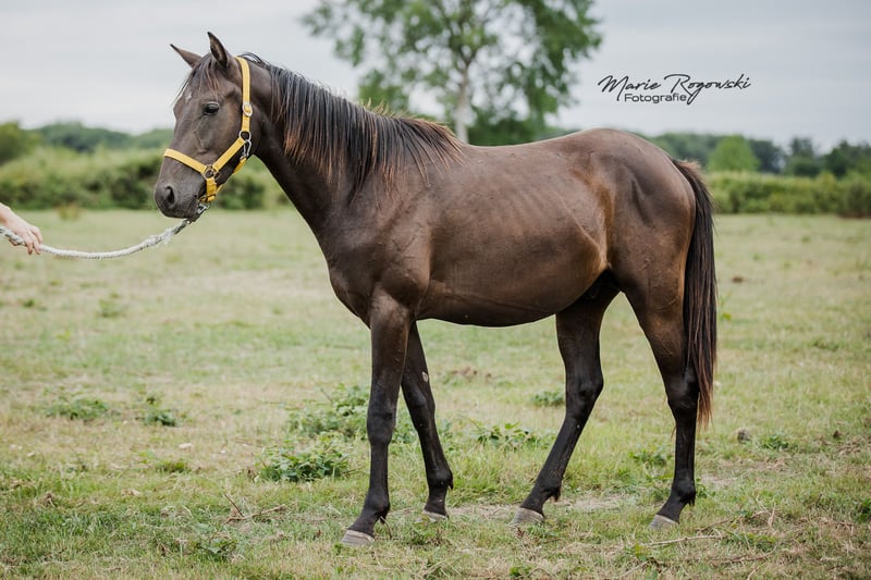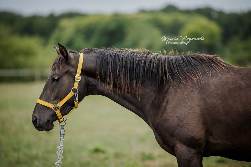 Late-born young stallion (12.09.2022) from color breeding program. Son of the exceptional English thoroughbred in smoky-cream T C F Palladium xx (True Colours Farm Canada) and an equally rare classic champagne warmblood mare (!!!) (ZfDP) by Rapptänzer OLD - Khalvin Khlein KpM (Partbred Arabian special champagne USA). Born in France with Zangersheide passport (main book) and IFCE. Very harmonious, compact young stallion with a simple Créme gene, which he can also pass on. Versatile and versatile. His final height will be around 162-164 cm at the age of six. Now the youngest boy in the group, he is enjoying his youth out in the field rearing big lads, while maintaining daily contact with people and handling them with curiosity and determination at stud. Feeding, grooming, hoof care, leading, ground course and loading (truck transport) are familiar, as are worming and vaccination. Last Smoke goes into careful, nurturing hands, can also stay for another year for needs-based rearing (with an old stallion) and will be trained further.
